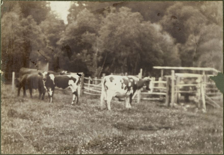 This photograph of cows is included with a photograph captioned "John Roots and his Dog, Kawhatau". John Roots, an early settler, was known to have a farm at Upper Kawhatau, ten miles from Rangiwahia in the Ruahine Ranges. It was an isolated area with few services. It is unknown if this is John Roots senior or junior.