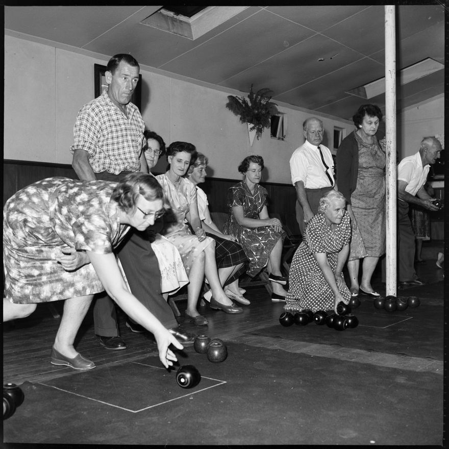 This image was taken for a story that ran in The Manawatu Evening Standard on 28 February, 1964. "Scenes such as this, at the Scottish Indoor Bowling Club, will shortly be taking place in the Manawatu district where there are now 2641 players registered with the Manawatu Centre, which embraces Rangitikei, Feilding and Palmerston North."