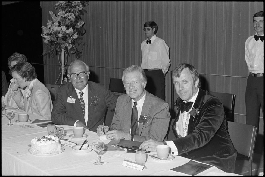 This image was taken by the Evening Standard on the 12th of February 1984 and was published on the 13th. It depicts the Lloyd Morgan Lions Clubs charitable trust dinner, which hosted former United States president Jimmy Carter and his wife Rosalynn.