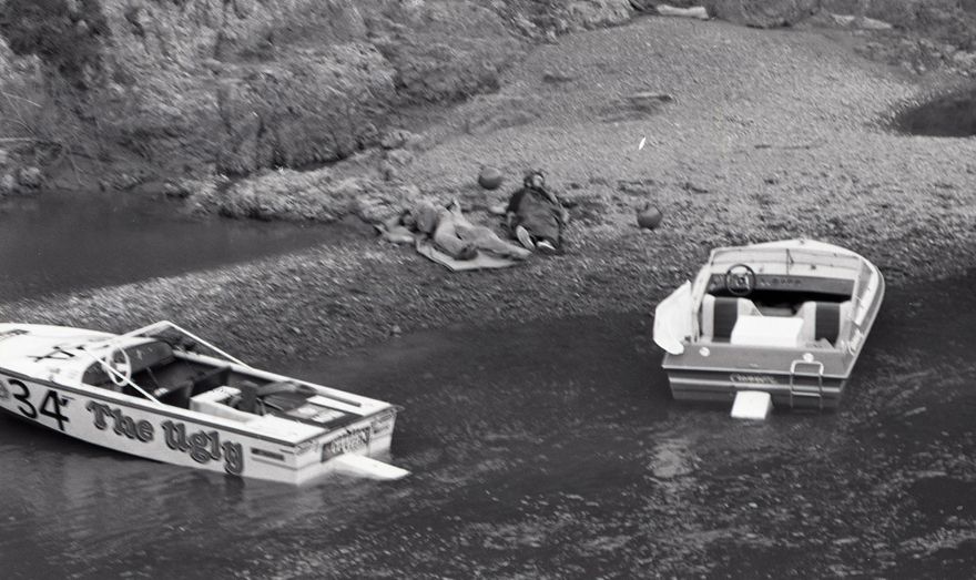 This series of images were taken for a story that ran in The Manawatu Evening Standard on 22 September, 1978. The article details a mid-river collision in the Manawatū Gorge during the Manawatū River stage of the 1978 CItizen Watch Jet Boat Marathon. The two boats that collided were Campbell Wilkie's "The Ugly" and Hilton McLachlan's "Ruffian" (with Ross Baker and Charles Hughes as crew). A third boat skippered by Bryan Harvey sustained damage whilst avoiding the collision. The photograph of P. Bayens' boat included in the article was not found with the negatives.