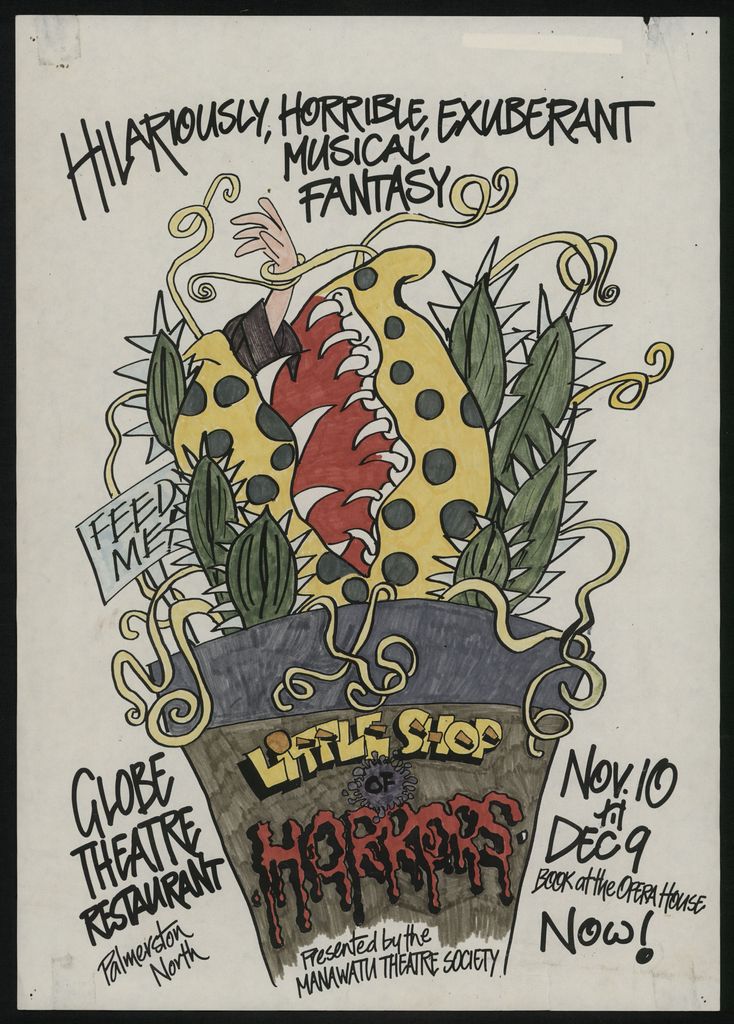 "Hilariously, Horrible, Exuberant Musical Fantasy. Little Shop of Horrors. Globe Theatre Restaurant, Palmerston North. Nov 10 - Dec 9. Book at the Opera House Now! Presented by the Manawatu Theatre Society." Part of a collection of posters that were displayed in the Public Library in the 1970s - 1980s.