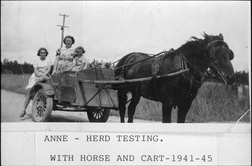 Annie Wilton (b. 1921) attended a Herd Testing course at Massey Agricultural College (now Massey University) during World War Two and afterwards worked in the Manawatu area. Due to petrol rationing a horse and card was used as a work vehicle. Annie was the daughter of Nellie and Frederick Wilton who farmed on the “Gorge Block”, and later married Samuel Staples a dairy farmer of Pahiatua. The young girls are probably her sisters.