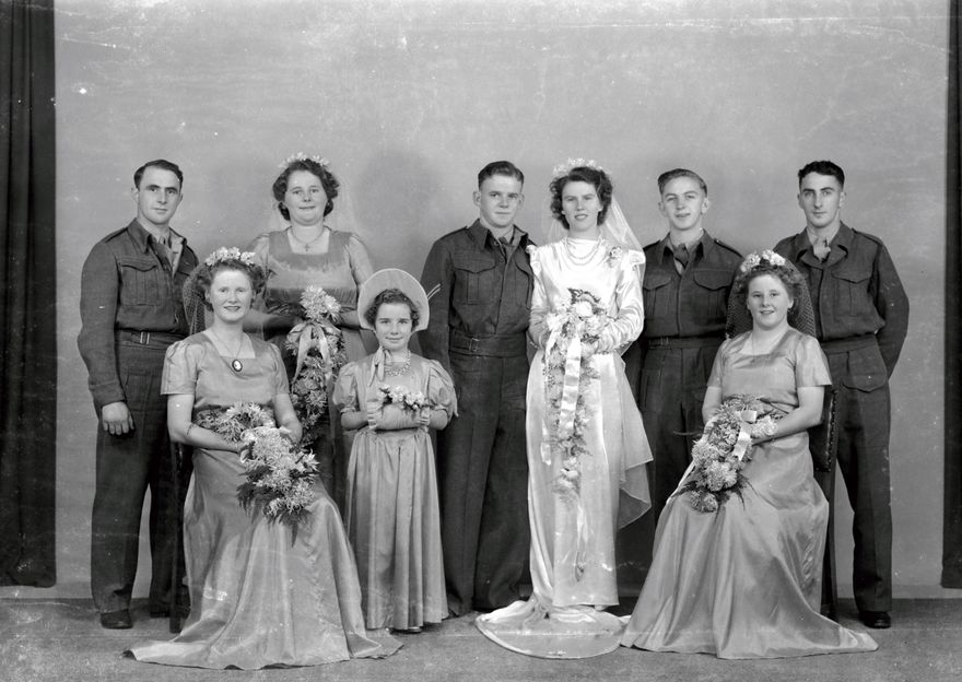 A group photograph of Mr & Mrs Johnstons wedding party. This photograph includes three sets of bridesmaids and groomsmen, as well a flower girl. All of the men are in military uniform.