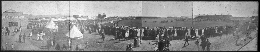 A panorama of the Manawatu A&P Show of 1915. The first Agricultural and Pastoral Show in Palmerston North was held in 1886, at the Showgrounds. the photograph shows that it had been either folded or cut into four parts.