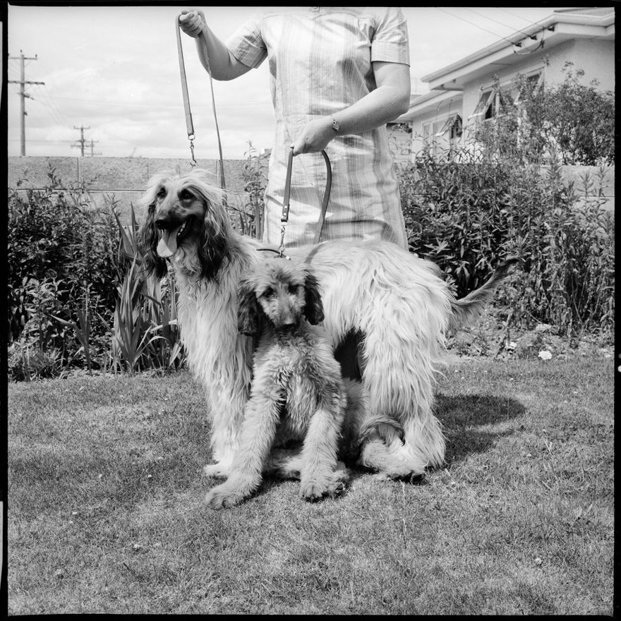 This image was taken for a story that ran in The Manawatu Evening Standard on 21st December 1965 "This four month old Afghan dog pup "Do-Yak", with mother "Shara", bred in Palmerston North by Mr. and Mrs. A.Y. Douglas, left for Australia on Saturday for its new owners-breeders. Both parents, Shara and Devil were imported from England by Mrs. Douglas and her daughter Jennifer, one of her triplet daughters. Another daughter, Jillian, also owns her own Afghan."