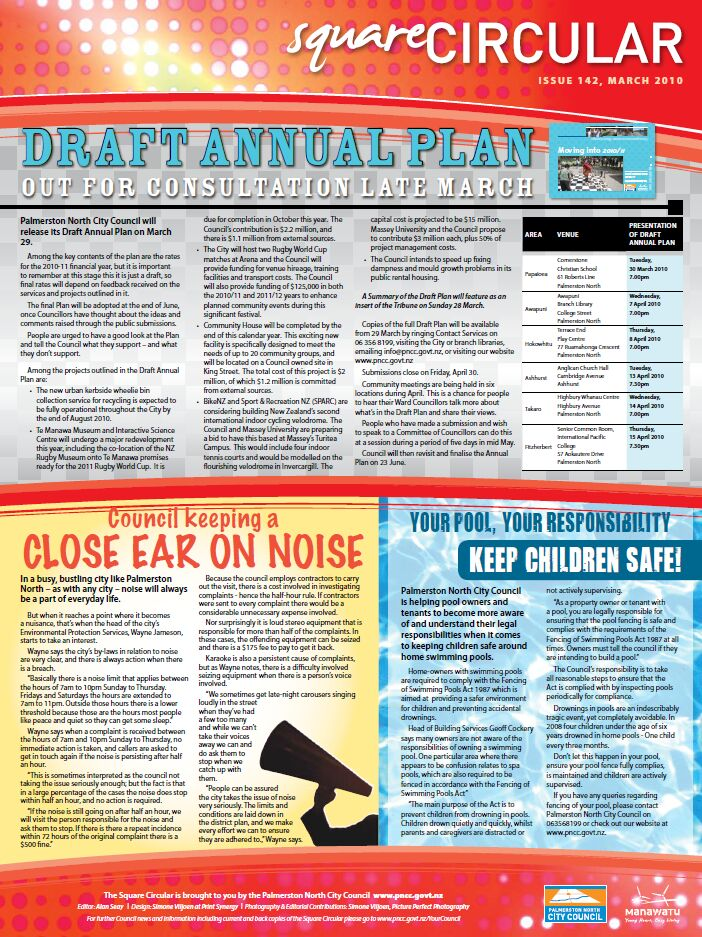 The Square Circular was Palmerston North City Council's monthly community publication, informing Palmerstonians of PNCC initiatives, activites, and events. This month's issue includes: Draft Annual Plan; Noise Control; Pool Safety; Council Budget; City Archives; Events; Victoria Esplanade; Council Fees; Centrepoint; Arena Manawatu; Te Manawa.