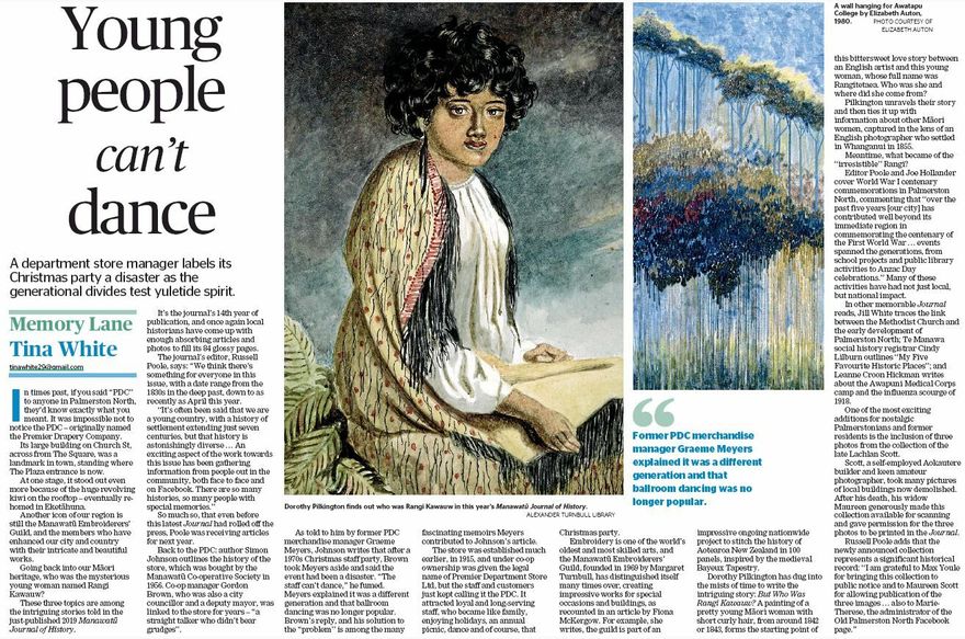 Journalist Tina White's weekly "Memory Lane" article in the Manawatū Standard. A review of articles from the Manawatū Journal of History, Volume 15 (2019). The journal, published annually, contains articles on the history of the wider Manawatū area, written by several contributors.