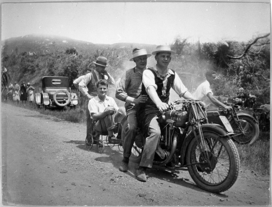 The motorcycle in the foreground is an Ariel. The riders are unidentified.