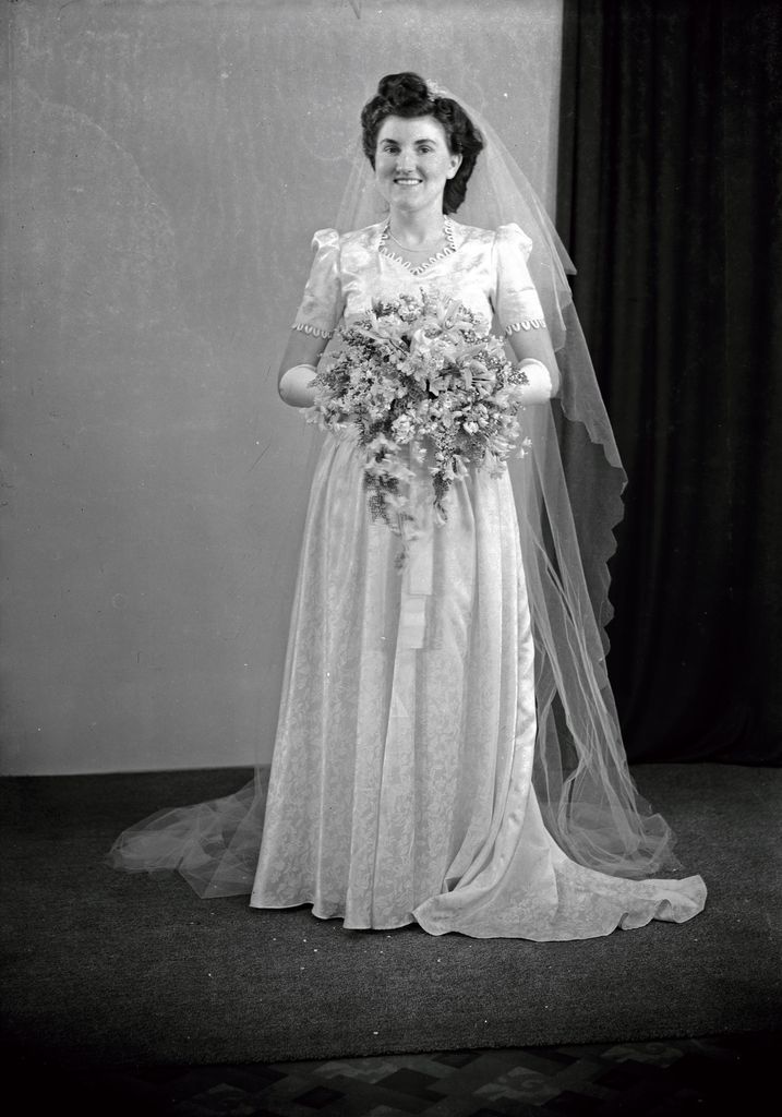 Mrs Greening, who is newly married, poses for her formal wedding shot. Notice the fine picot trim on the sleeves and neckline of her wedding dress. Also see 2012N_ELMAR_4_006512