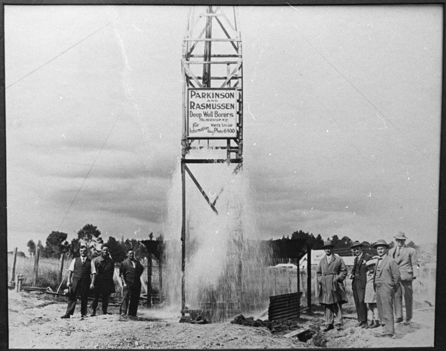 A Parkinson and Rasmussen - Deep Well Borers well and tower with water spouting out of the ground. Some workers and dignitaries are grouped around. The company worked extensively for the Palmerston North City Council, sinking successful wells in Heretaunga Street, Vogel Street and at the gasworks. They also worked around the lower North Island. They later became R W Parkinson and Co.