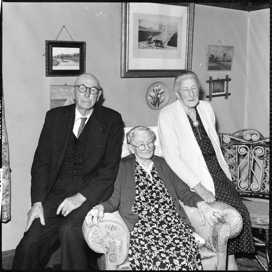 This image was taken for a story that ran in The Manawatu Evening Standard on 19th January 1966 "Friends and relations of Miss Marion L. Squire yesterday gathered at her home at 237 Ferguson Street to celebrate her 90th birthday. Miss Squire was the fourth of nine children of the late Mr. and Mrs. W.D. Squire, of Stoney Creek Road, Bunnythorpe. With her sisters, Miss Squire as a five-year-old, walked three and a half miles each way to the old Whakarongo School. Later moving to Palmerston North, where her father operated a joinery factory, Miss Squire became a first day pupil of the Campbell Street School. Many a time she drove a horse and trap from Palmerton North to Ohakune when there were no bridges on the road beyond Taihape, and also thought nothing of walking five miles each way to go to church on Sunday. --- The picture shows Miss Squire with her only brother, Mr. W.H.J. Squire, who is 83, and one of her sisters Mrs. F. Law, aged 88.