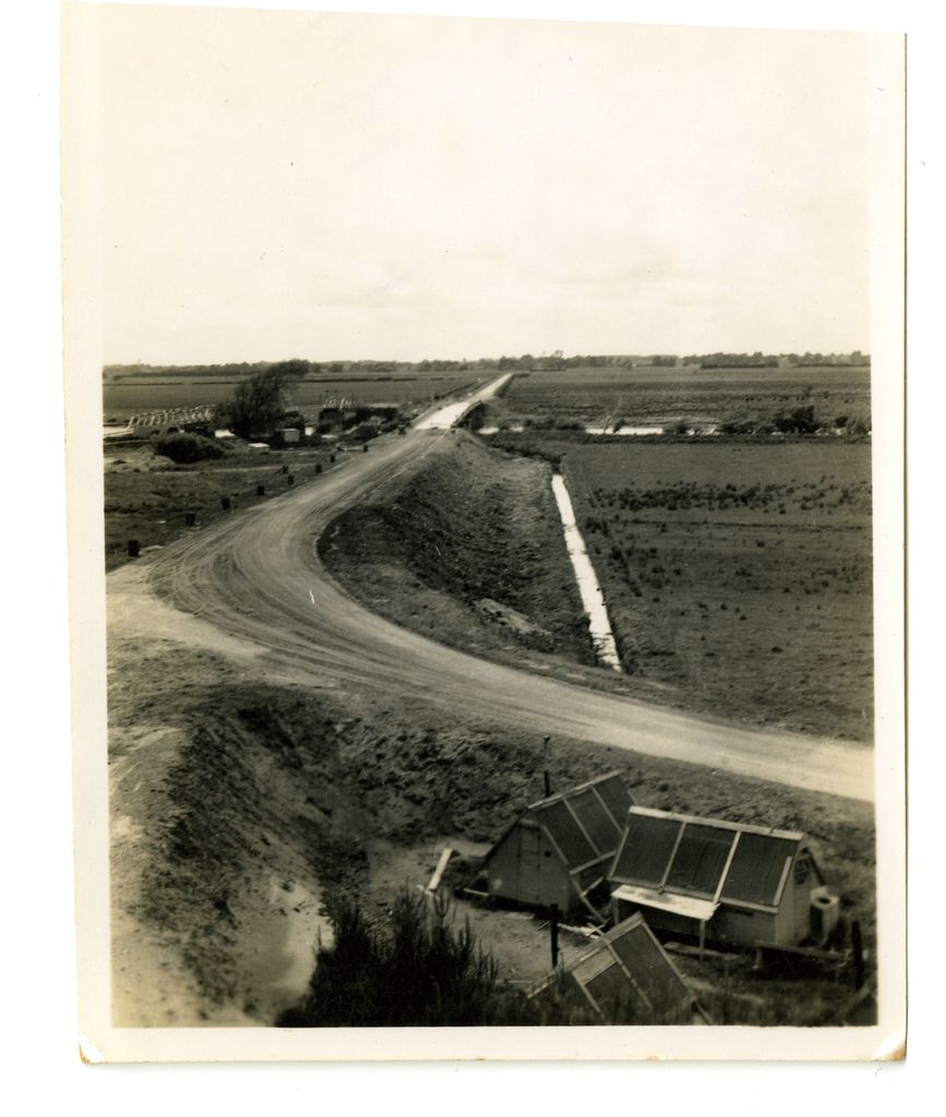 One of a group of photographs from Ron Grammer's working life in bridge engineering in the 1940s and 1950s. Ron Grammer's hut can be seen in the corner of the photo, with Whirokino old road on right, straight to new bridge.