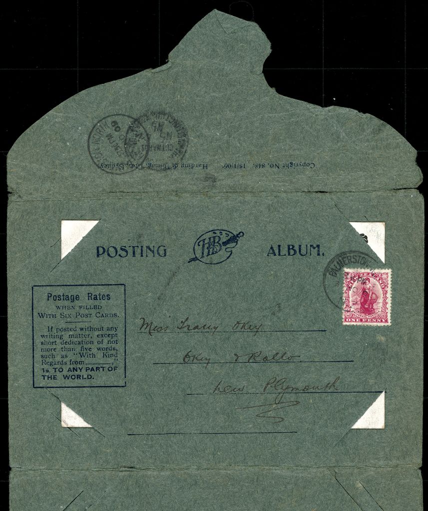 A "posting album" containing post cards of some Palmerston North scenes, including the Post Office, The Square, the Hospital and the Railway Station. It includes a handwritten note that reads, "With lots of love, Mal [or Mae]".