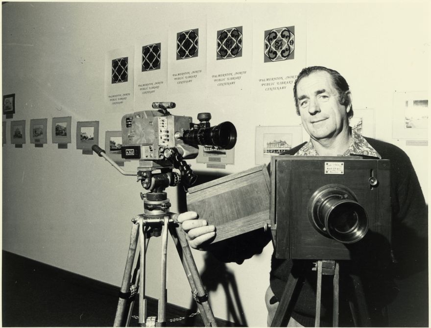 - Morris Shailer of Rongotea, is the great-grandson of George William Shailer, an early Manawatu photographer. Morris Shailer was a freelance cameraman working under contract for the Broadcasting Corporation at the time this photograph was taken. On the left is his camera, an American GTX 16 mm movie camera and on the right is G.W. Shailer's plate camera made by Marion Co. of London. This photograph was taken at the Palmerston North Public Library centennial celebration.