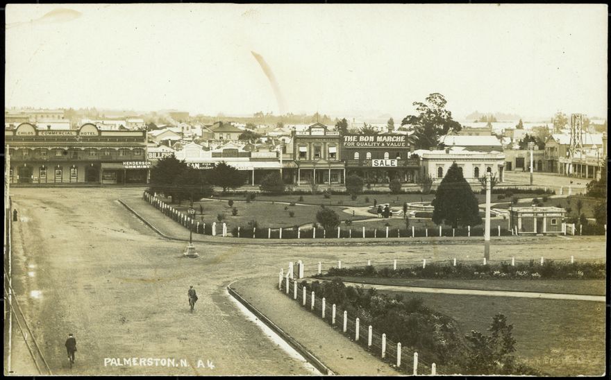 This postcard looks towards the section of The Square between Main Street West and Coleman Mall. The base of the fountain that once stood in that section of The Square is just visible in front of the Bon Marche.