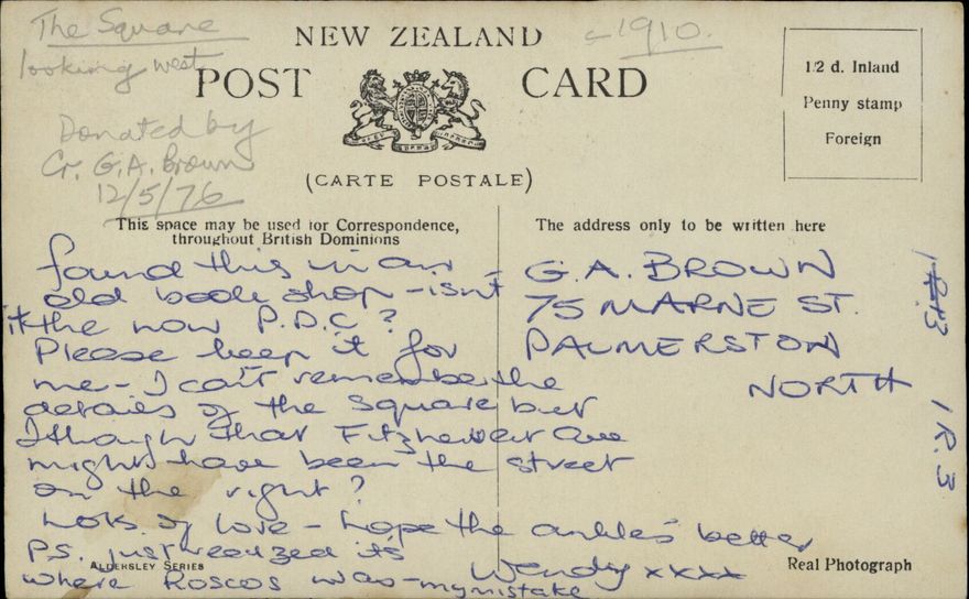 - This postcard looks towards the section of The Square between Main Street West and Coleman Mall. The base of the fountain that once stood in that section of The Square is just visible in front of the Bon Marche.