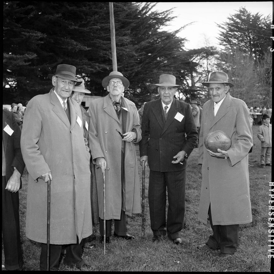 This image was not published in The Manawatu Evening Standard. Four men, three of whom are the Richardson Brothers, stand at the 75th Bulls Rugby jubilee. Another photo of the brothers was published 25 June, 1963.