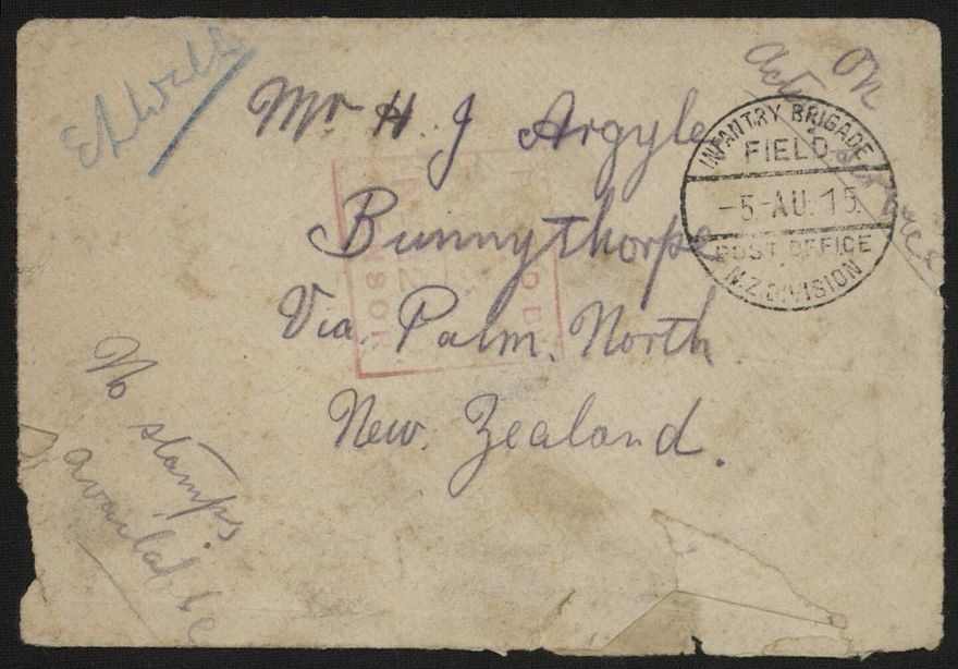 Envelope addressed to Mr Henry Argyle of Bunnythorpe, from one of his sons, Pat or Len, who served overseas in World War One. Both men died at Gallipoli in 1915.