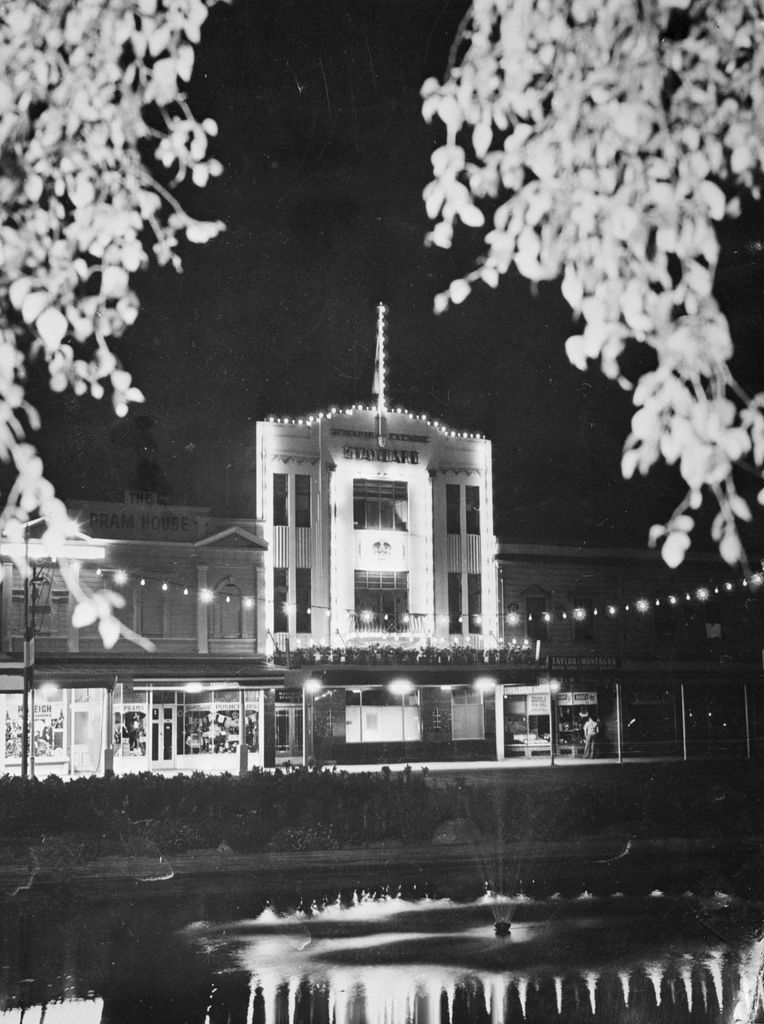 Looking across the fountain playing in the Lakelet in The Square at night to the Manawatu Evening Standard building. The newspaper began publishing in Palmerston North in 1880. These premises were constructed in 1937. The building was demolished to make way for a new building in 1974. To the left is the Pram House, which sold bicycles, prams, seagrass furniture and pushchairs. To the right is Taylor and Montague, Land & Estate agents and Bob's Music Shop.