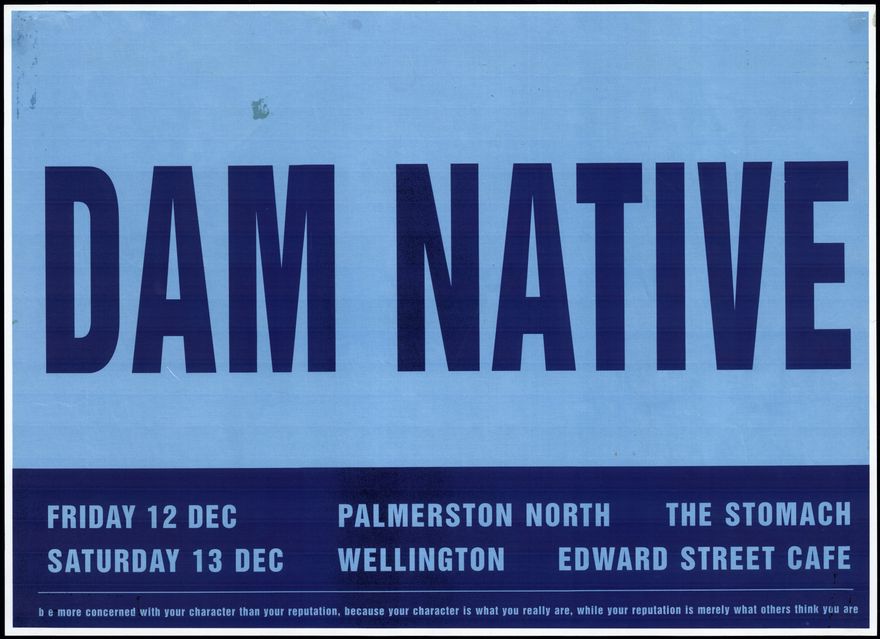 Dam Native. Friday 12 Dec Palmerston North The Stomach. Saturday 13 Dec. Wellington Edward Street Cafe. Part of a collection of posters that were displayed at The Stomach, Lombard Street, venue for Creative Sounds Society Incorporated.