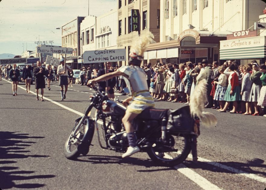 This float depicts the 'anti procesh' procession, with students hold alliterative banners stating: Stop Student Stunts, Condemn Capping Capers, Veto Varsity Vulgarity and so on. They are walking along Broadway Avenue preceded by a unicyclist, a piper and a motor cyclist wearing a hat adorned with toi toi flower plume. The T&G, Bennetts Bookshop and Hopwood's Hardware buildings can be seen on the right of the photograph.