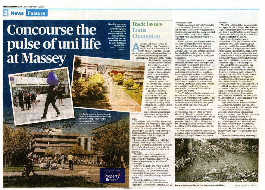 Local historians weekly "Back Issues" article in the Manawatū Standard. The history and significance of the concourse, the central pedestrian thoroughfare at Massey University Palmerston North campus.