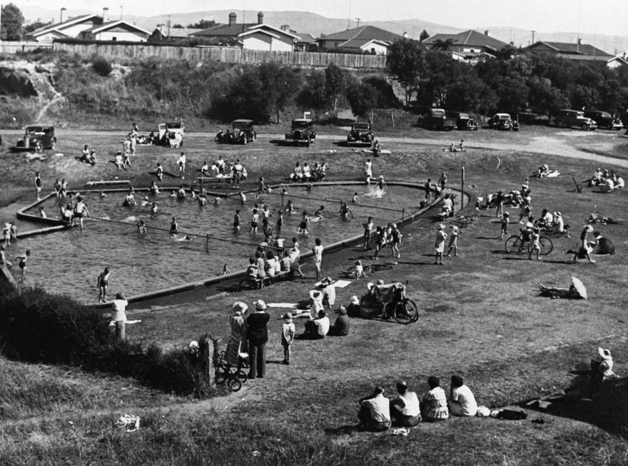 Memorial Park (previously named Fitzroy Park) at Terrace End, was formerly a metal pit used by the Railways Department 1876-1937 for ballast. The Palmerston North City Council purchased the 21 acre site in 1938 and developed it into a recreational and sporting area. A WWII memorial was erected 1952 and in 1954 Fitzroy Park was officially dedicated as Memorial Park. The pool was constructed c1939.