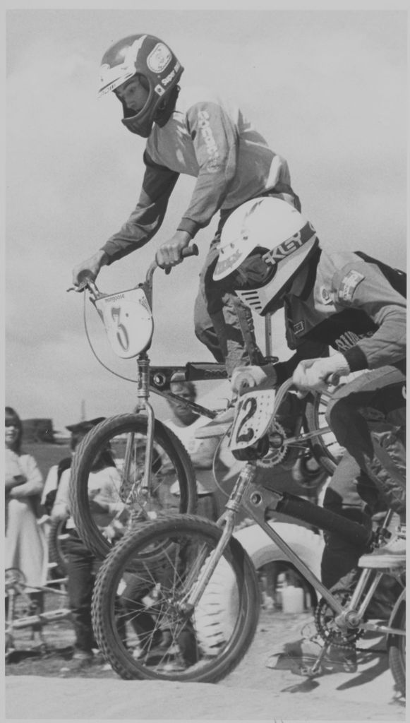 BMX riders participate in the events raced at the opening of the new BMX track at Vautier Park, Palmerston North. The track was officially opened in March 16 1982 by City Councillor Bill Johson. More than 350 riders as young as three to those in their 20s took part in the day's events.