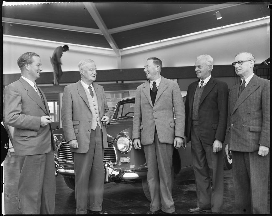 This image was taken for a story that ran in The Manawatu Evening Standard on 10 August 1960 "Directors of Jolly & Mills Ltd. From left to right: A.M. Jolly, F.G. Jolly, E.W. Mills, P.C. Betts and W.H. Knight share a joke prior to the opening of their new premises."