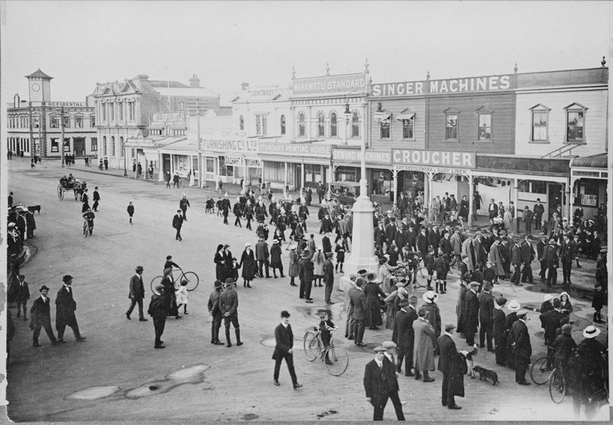 This photograph shows returned soldiers marching to All Saints Church to remember their fallen comrades, who served in World War One. Beyond can be seen the Occidental Hotel with clock tower (on the corner of Fitzherbert Street) which shows that the photograph must have been before 1927 because the Occidental Hotel burned down in that year.