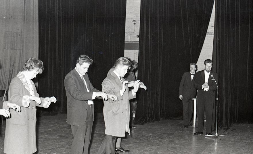 Caption: "International Hypnotist Janus Vroegryk had dozens out on the stage when he visited P.N. recently on a tour of the country. A packed house attended the Saturday Performance."