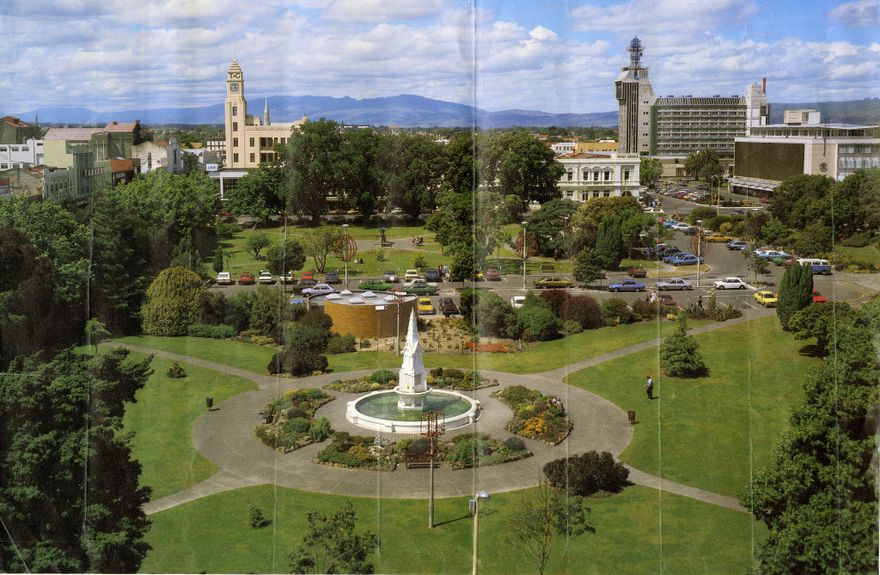 The Coronation Fountain, built 1902, is in the forefront of this view of the Square. Directly behind can be seen the men's toilets built in 1982, and the central parking precinct. Buildings in the background are the T & G tower on Broadway and the Telecom tower and building on Main Street. Either side of the Main Street corner of The Square can be seen the Post Office (left) and the Palmerston North Public Library.