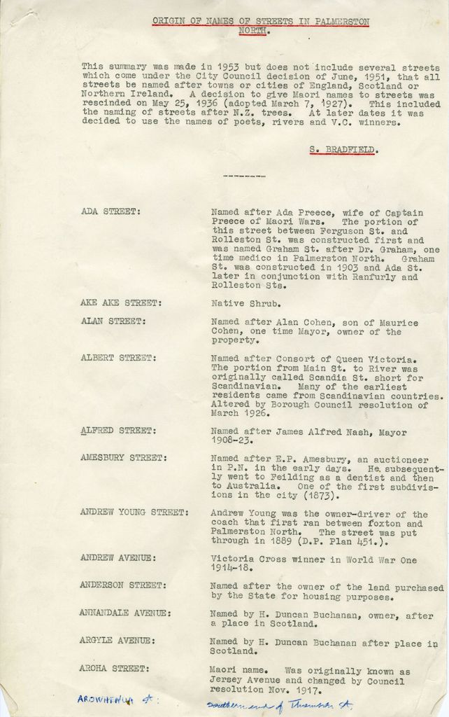 Typewritten list of the names of streets in Palmerston North and their origins, as in 1953. Includes some alterations and additions in the hand writing of A G S Bradfield. An amended version of this list was published in 'Forgotten Days' by Bradfield in 1956.