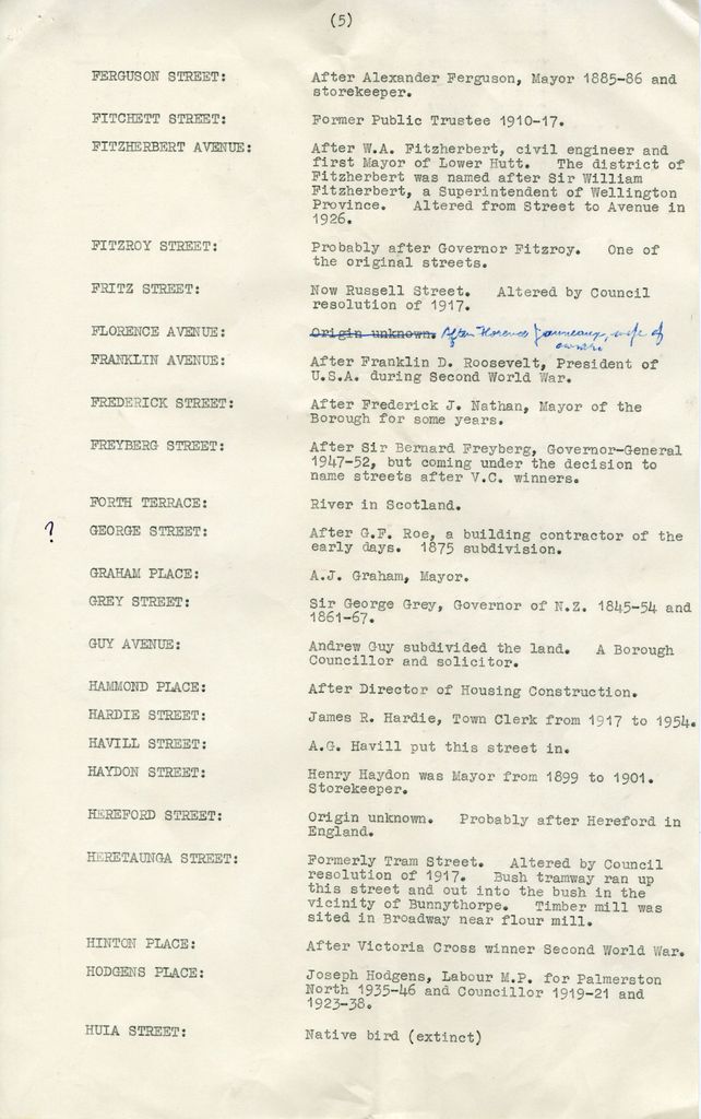 Typewritten list of the names of streets in Palmerston North and their origins, as in 1953. Includes some alterations and additions in the hand writing of A G S Bradfield. An amended version of this list was published in 'Forgotten Days' by Bradfield in 1956.
