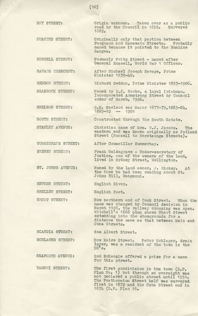 Typewritten list of the names of streets in Palmerston North and their origins, as in 1953. Includes some alterations and additions in the hand writing of A G S Bradfield. An amended version of this list was published in 'Forgotten Days' by Bradfield in 1956.
