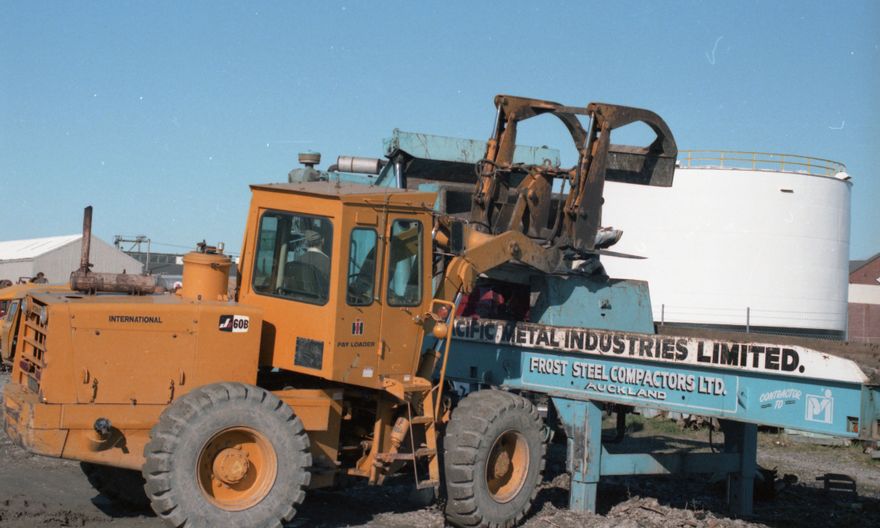 These photographs show car being crushed and stacked in a scrap metal yard. It is thought to show Ingot Metals Ltd, which was located at 27 Keith Street, Roslyn.