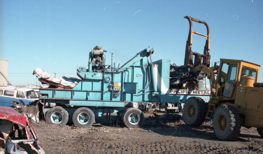 These photographs show car being crushed and stacked in a scrap metal yard. It is thought to show Ingot Metals Ltd, which was located at 27 Keith Street, Roslyn.