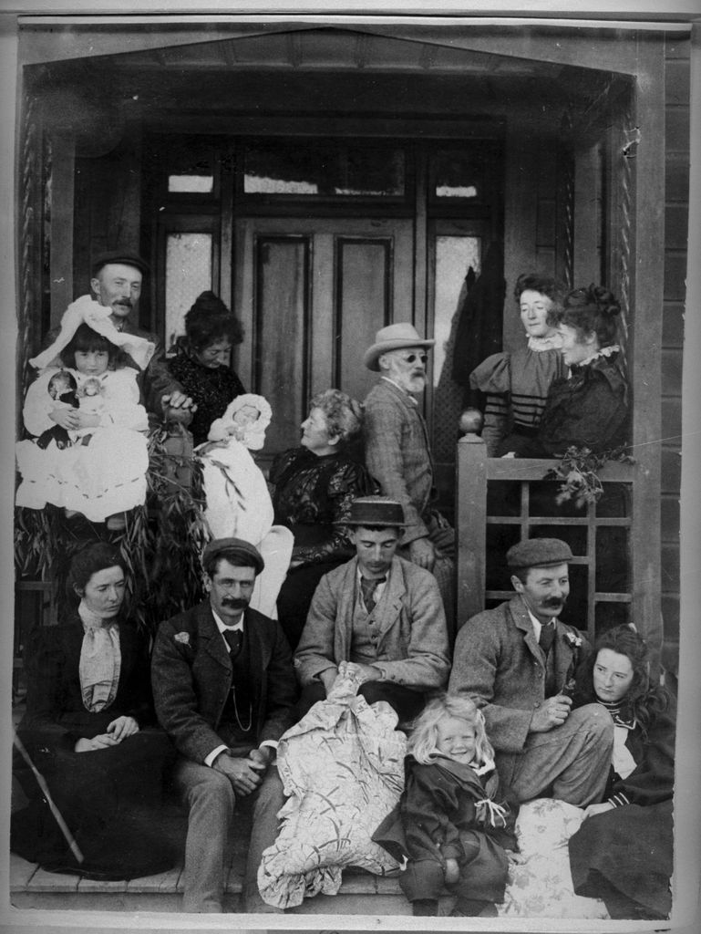 The Slack family at 'Waitoitoi', Awapuni. Back row (from left): Jim Slack with niece Mildred Hewett; Jane Hewett nee Slack holding Audrey Hewett; Charlotte and William Slack; Ethel Hamilton nee Slack; (probably) Mrs Temple nee Slack. Front: Violet Slack; Fred Hamilton (husband of Ethel); Jack Slack; Vesey (Besey?) Hamilton (child); George Slack; Mimi Slack