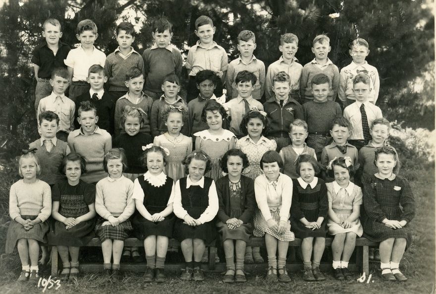 Standard One class of West End School, taught by Mrs Hay (not pictured). From left. Back Row: Cyril Hodge; Neil King; Ken Turner; Ian Matheson; Keith Reynolds; Selwyn Francis; Gordon Cameron; Rodney Cudby; Peter Bridge. Third row: Robert Taylor; Wayne Ogier; Robert Terry; Kevin Ram; John Te Rangi; Nicholas Thompson; Gengarry McDonnell; Bobby Bell; Donald Scott. Second row: Gordon Wild; Graham?: Dorothy Hardy; Carol Martin; Unknown; Unknown; Perry Gemel; Mark Fuller, Paul Rowland. Front Row: Catherine Imery; Sandra McNeil; Susan Sangster; Ann Trembath; ? Johnston; Pauline Loveridge; Raelene Sutherland; Pamela Robinson; Colleen Mason (1 unnamed).