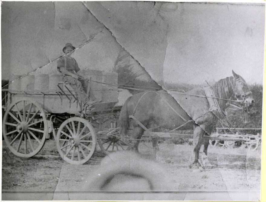 Shown here is Mr Arthur Gloyn with his horse and a cartload of milk cans for processing.