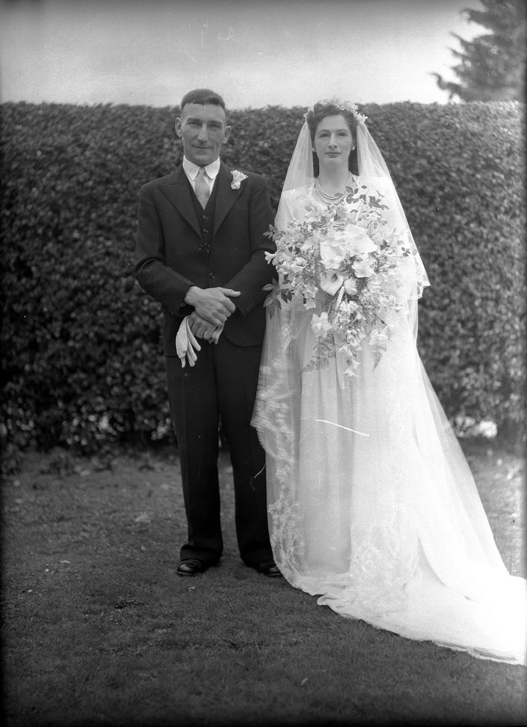 Bride and groom photographed in a garden on their wedding day.