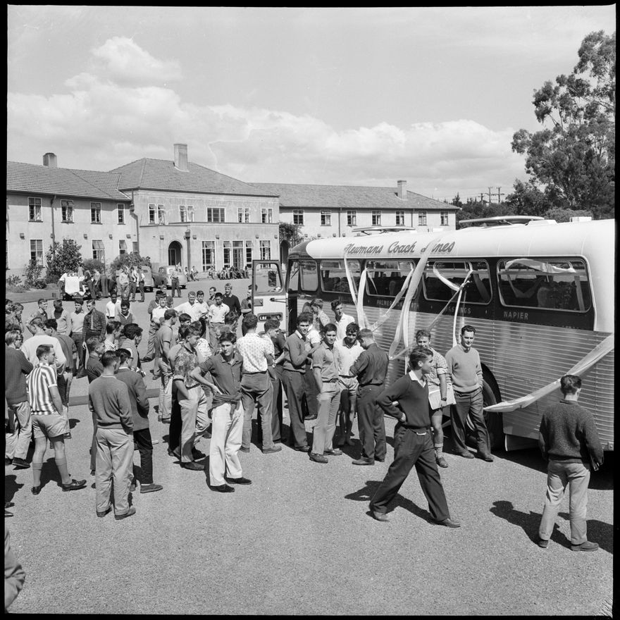 This image was taken for a story that ran in The Manawatu Evening Standard on 14th March, 1963. "Mops and brooms formed the armoury of the "guard of honour" of students who formed up to escort the visiting Members of the Government and their wives from the Massey University refectory to their transport bus yesterday. The visitors walked on the traditional red carpet between disciplined lines of dust-removing implements. In the lower picture is the bus embellished with characteristic decorations by the students ."