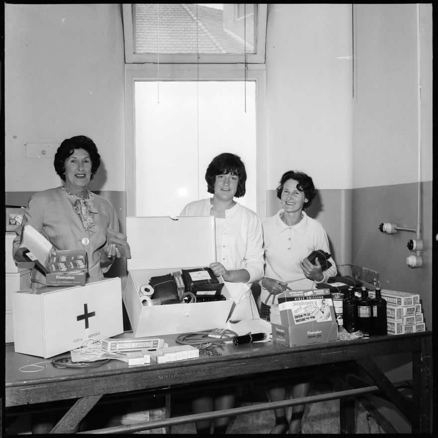 This image was taken for a story that ran in The Manawatu Evening Standard on 2nd December 1965 "Mrs. C.R. Carson (left) and Mrs. J McDonald (right), members of the women's section of the Palmerston north R.S.A. assisted by Miss C. Carson were busy packing the last of the 36 first aid kits for civil defence use today. Other helpers have been Mesdames D. Lovelock, J. Buick, and G. Sheppard. The fully equipped kits will be distributed to schools in the district."