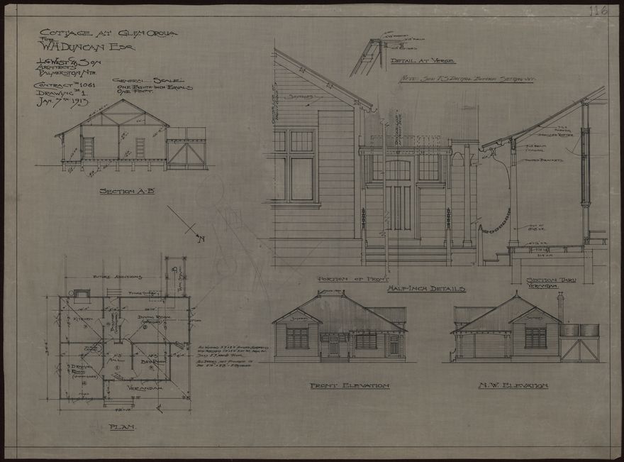 This plan for a single-storey cottage with verandah was designed by L. G. West & Son for W. H. Duncan. The Danish-born architect Ludolph Georg West (1846-1919) established an architectural practice in Palmerston North in about 1880. In 1912 he formed a partnership with his son, Ernest Vilhem West, who continued the business after his father's death.