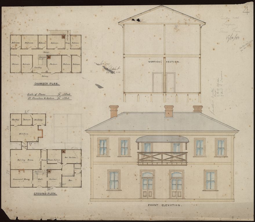 This architectural plan was produced by L. G. West in 1889. It depicts the two-storey Junction Hotel that was designed for Thomas Fraser of Longburn. This featured a bar and dining room on the ground floor and accommodation on the upper level. The Danish-born architect Ludolph Georg West (1846-1919) established an architectural practice in Palmerston North in about 1880. In 1912 he formed a partnership with is son, Ernest Vilhem West, who continued the business after his father's death.