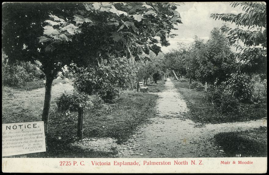 The sign on the side of the image reads, "Notice. Any Person riding a Bicycle, lighting a Fire, Cutting, Damaging or removing any Tree, Fern or Shrub or Structure within this Reserve, will be Prosecuted. By Order R N Keeling, Town Clerk. P.N. Borough Council." Development began on the Victoria Esplanade in Palmerston North, named to mark Queen Victoria's 60th jubilee, in 1897. The bush walk was probably originally laid out c1900-1905.