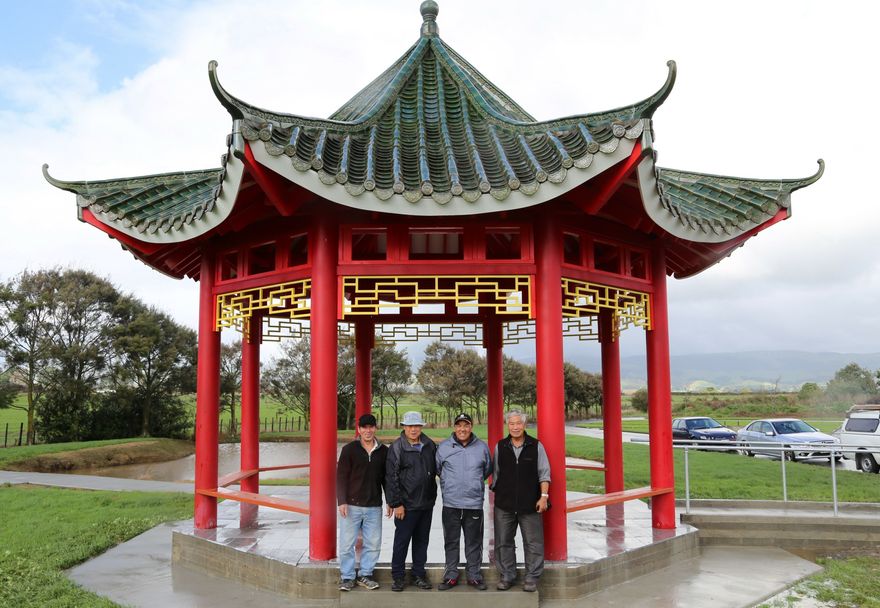 Manawatū Chinese Association President Tom Young (second from left) and fellow members of Palmerston North's Chinese community. The gazebo was gifted to the city of Palmerston North by the Manawatū Chinese Association. It was opened on Sunday 30 April 2017. Kelvin Grove Cemetery is situated on James Line, Palmerston North.