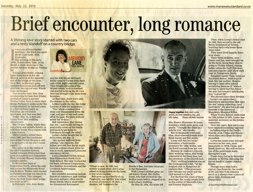 Journalist Tina White's weekly "Memory Lane" article in the Manawatū Standard. The family story of Robert (Bob) and Lorna Voss, their long marriage and memories of the Tiritea Valley, where they lived for most of their lives.