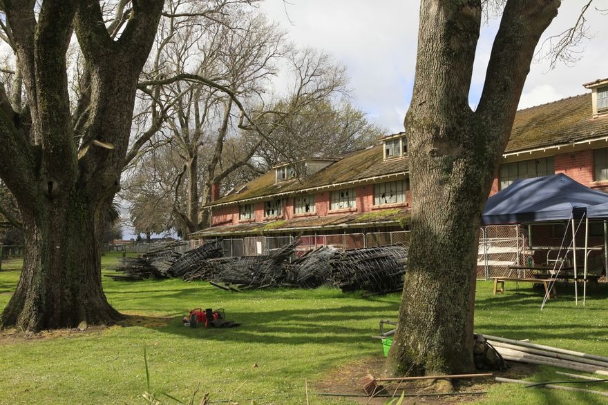 A project got underway in 2014 to clean up and restore the Awapuni Memorial at the Palmerston North Racecourse. This photograph shows one of the old race course buildings adjacent to the memorial on the day of some of the early work in clearing the site. The work was carried out by the 2nd Health Support Battalion of the New Zealand Army based at Linton Camp, and Council staff volunteers.