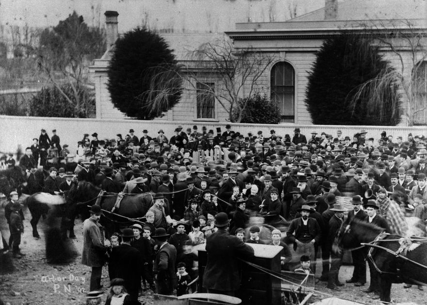 A large crowd gathered to plant a tree in the middle of the triangular picket enclosure (centre of photo), in Broad Street (Broadway Avenue) near the junction with The Square, Palmerston North. The Bank of Australasia is in the background.
